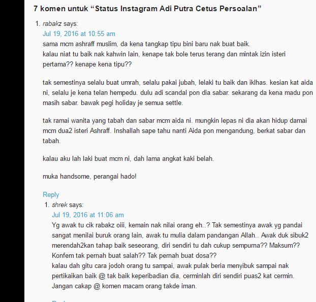 Gambar yang dimuat naik semalam tidak disertakan dengan kepsyen manis, hanya sekadar meletakkan emotikon berbentuk senyuman. Pada masa yang sama, ruangan komen juga dibanjiri dengan peminat beliau yang rata-rata mendokankan kebahagiaan rumah tangga mereka walaupun masih ada juga yang berang dengan tindakan Adi menipu isteri pertamanya.